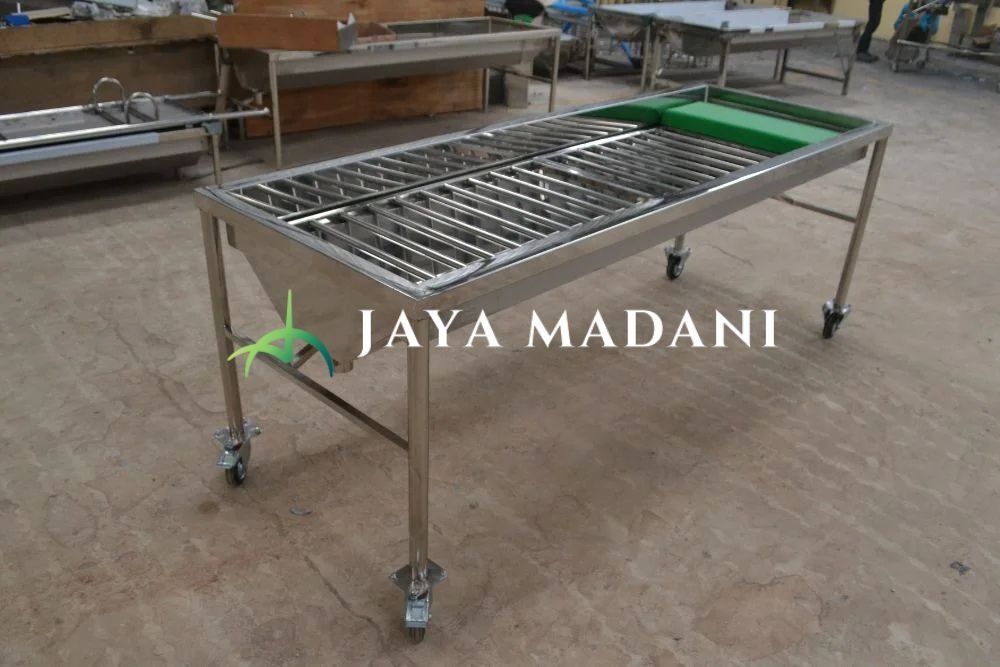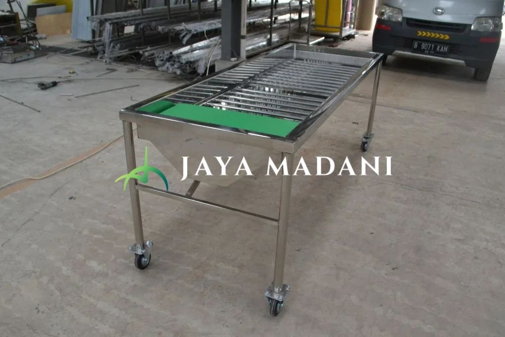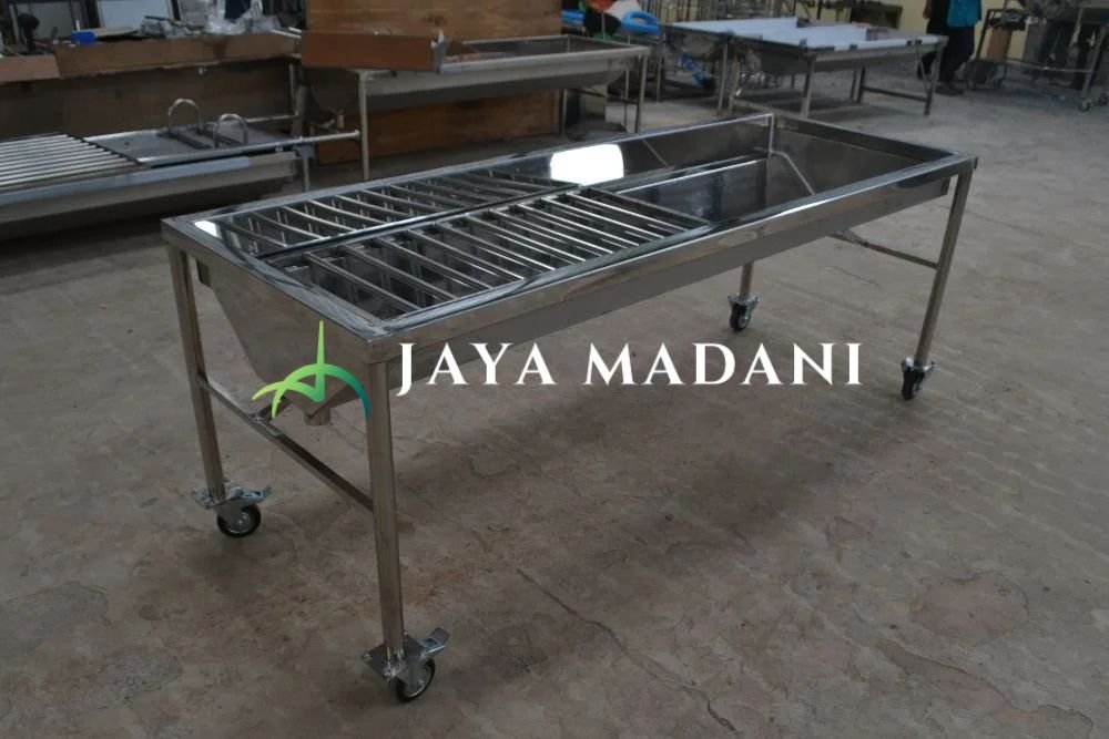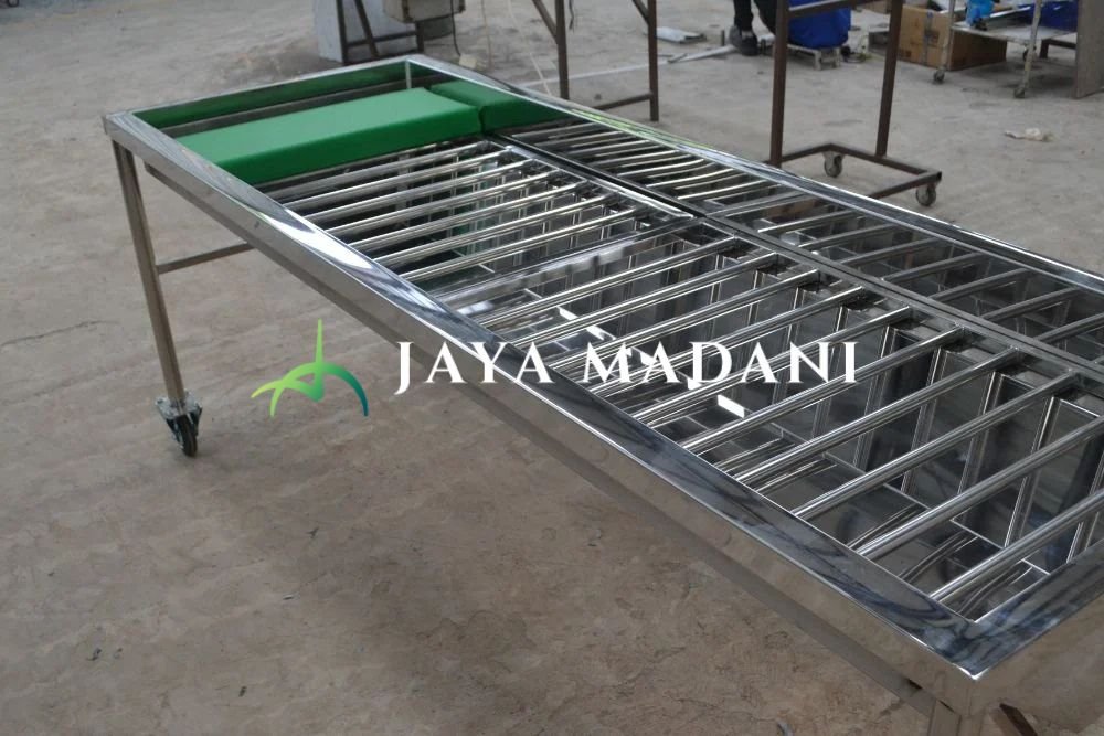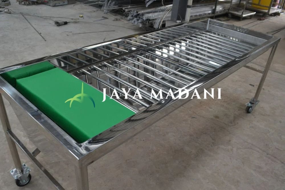 Media pemandian jenazah dengan ukuran dan model standar, dilengkapi bantal, selang pembuangan, dan berbahan stainless yang tahan air.